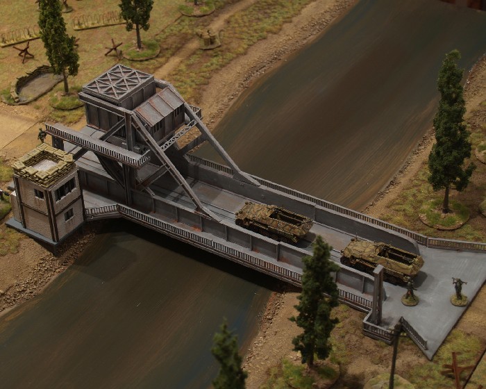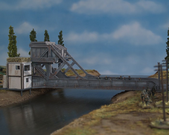 Für diese Szenarien habe ich meine Spielplatte durch ein weiteres Element, den Kanal, erweitert. Natürlich brauchte ich auch das Modell der Brücke selbst und das Café Gondreè. Hier habe ich, wie schon bei den Gebäuden von St. Mere Eglise, auf die wunderbaren Modelle von Jens Najewitz zurückgegriffen, der diese mit viel Schweiß und Herzblut umgesetzt hat. Hier der Link zu seiner Homepage, auf der man diese und andere schöne Gebäude (in verschiedenen Maßstäben) erwerben kann: http://www.lasermodellbau.de/