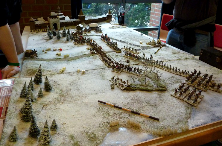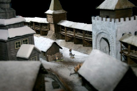 Neben dem schönen Wintergelände gab es auf der Platte auch einen Ausschnitt einer russischen Kleinstadt mit Befestigungsanlage zu sehen. Zu diesem grandiosen Gelände gesellten sich natürlich auch jede Menge fantastische Figuren und ich hatte die Ehre Frank Bauers Truppen mit einigen meiner Figuren zu ergänzen. Frank hatte sich für den Maßstab 1/72 entschieden, weil hier in den letzten Jahren einige tolle thematisch passende Figurensätze erschienen waren und ich beim 1/72 Figuren eh immer Feuer und Flamme bin. Bei diesem Projekt habe ich nicht nur an einer Armee gearbeitet, sondern sowohl Figuren der Russen, als auch des Deutschen Ordens bemalt. Das brachte etwas mehr Abwechslung beim Bemalen und außerdem konnte ich auch schon auf einige fertige Figuren beider Seiten zurückgreifen.