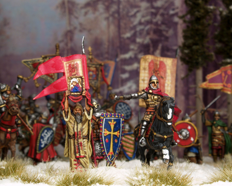 Die herausragende Persönlichkeit dieser Zeit war Alexander Jaroslawitsch Newski, ein Fürst der Rurikiden-Dynastie. Noch heute gilt er in Russland als der große Nationalheld und man stolpert förmlich über seine diversen Denkmäler. Die Figur des Anführers stammt aus der ersten Zvezda Packung zu diesem Thema, die beiden Fußfiguren sind vom Mittelalterspezialisten Valdemar.