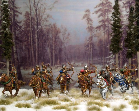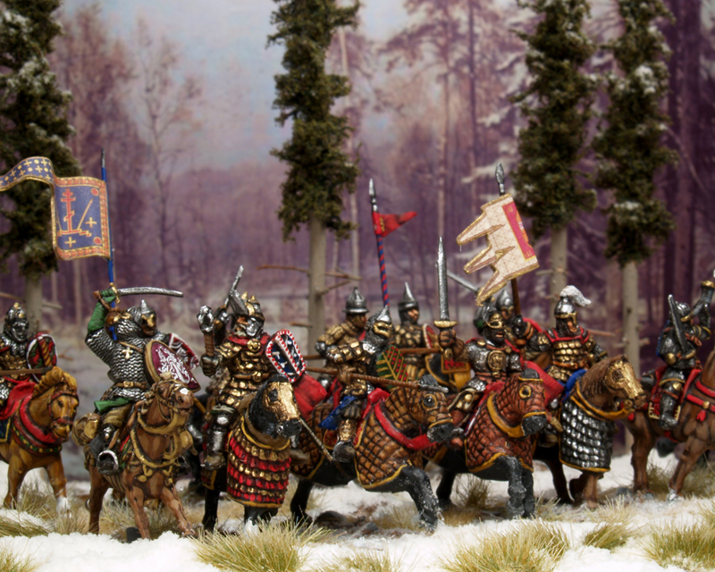 Die wellenförmige Verdrängung turkmenisch-mongolischer Steppenvölker aus den östlichen Ebenen trieb diese in die Dienste der Russischen Territorien. Sie wurden chernye klobuli, die Schwarzhüte genannt. Zu ihnen gehörten die Kipchaqs, die einen Großteil der berittenen Bogenschützen Novgorods bildeten. Die hier gezeigten Figuren der Firma Zevzda und Strelets zeigen eher einheimische Reiter, die in der Tradition der Steppenvölker kämpften.