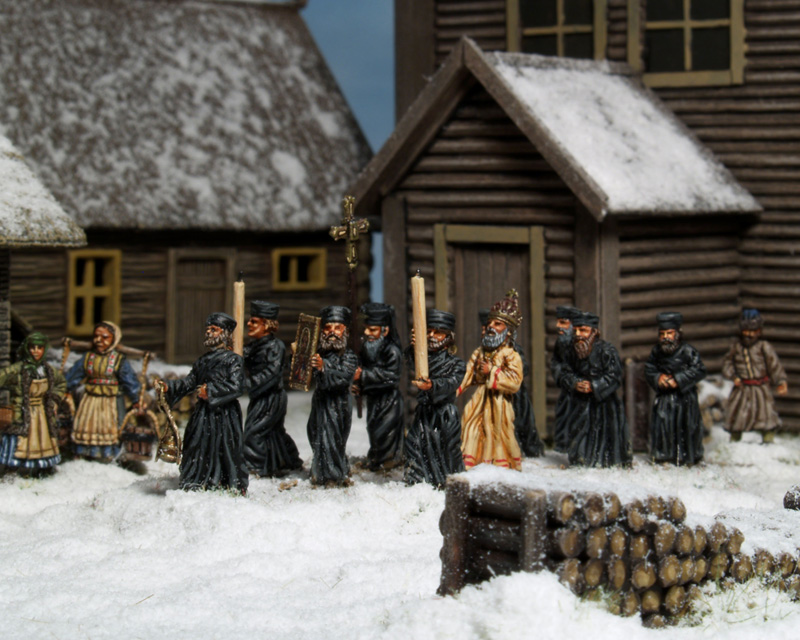 Neben den militärischen Einheiten haben ich auch noch einige Gebäude teilst selbst gebaut, wie die russische Holzkirche und teils Fertigmodelle bemalt, hier die Blockhäuser des Herstellers Pegasus. Außerdem kamen die großartigen Figuren von Frank Germerhaus zu Einsatz…