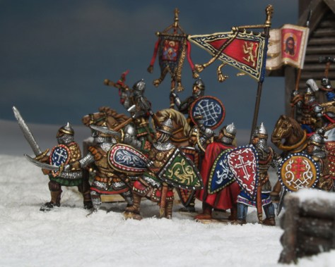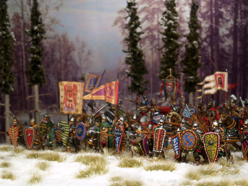 Die Druzhina bestand aus schwerer Kavallerie und wurde aus den engsten Gefolgsleute des Fürsten gebildet. Hier gibt es eine gute Figurenauswahl, da bereits 3 Hersteller dieses Thema beackert haben. Verwendet wurde aber vor allem Figuren der Firma Zevzda und Strelets.