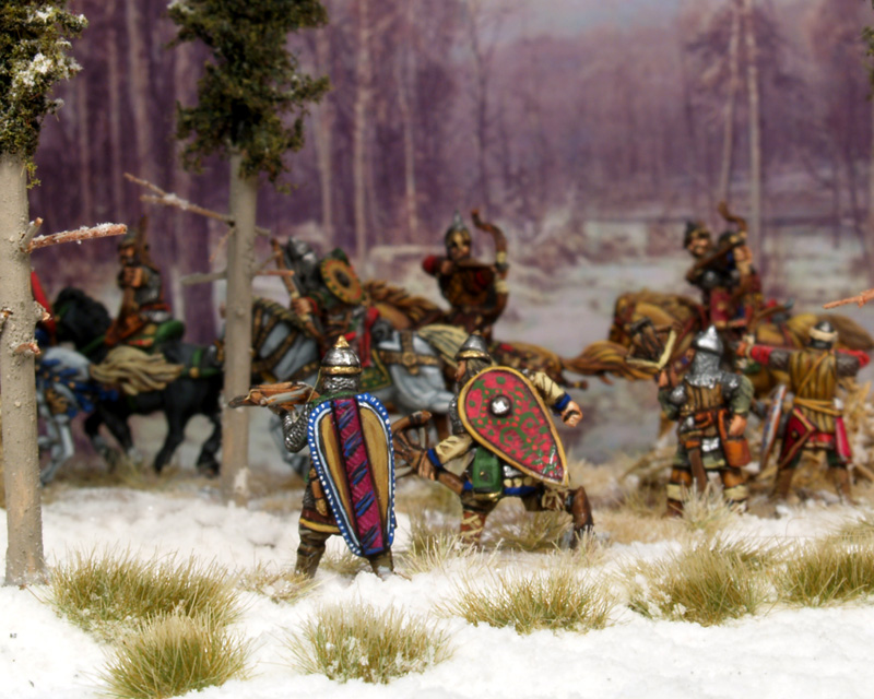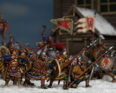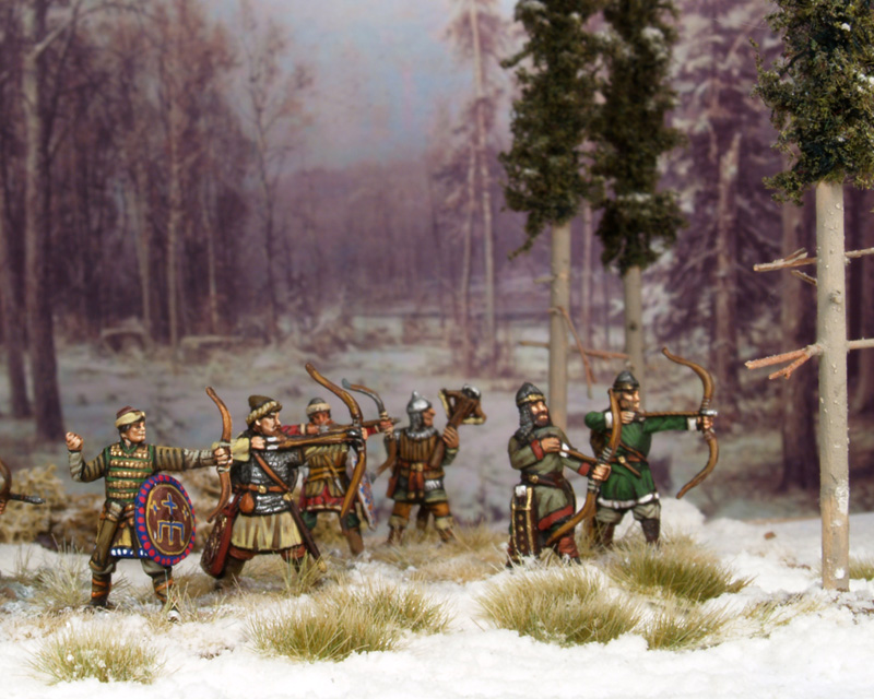 Hinter den Speerträgern wurden oft leichte Bogenschützen, die luchnik oder strelets, aufgestellt. Dabei fungierte der Schildwall der Speerträger als mobile Barrikade und hier zeigt sich auch der sehr defensive Charakter der russischen Heere dieser Zeit. Neben den Bogen wurde auch die Armbrust eingesetzt. Darüber hinaus gab es natürlich auch leichtbewaffnete Plänkler. Meine Truppe stellt eine bunte Mischung aus all diesen Truppengattungen dar und ist so universell einsetzbar.