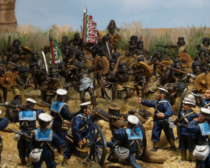 „Der Feind, der nun aus seinem Versteck auftauchte, war 1.000 Mann stark. Unter dem Schutz von Rauch und unübersichtlichem Gelände hatten sie sich angeschlichen und stürmten jetzt auf die Marinesoldaten und die 65er. Hundert von diesen dunkelhäutigen Arabern kamen mit großen Schritten über den felsigen Grund, Speer und Schwert in der Hand. Mehr als die Hälfte von ihnen wurde auf der Stelle niedergeschossen, aber 30 bis 40 Kriegern gelang es sich unseren Bajonetten entgegen zu werfen, wo sie schreckliche Wunden erhielten und verursachten.“