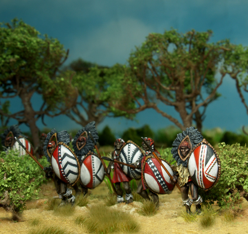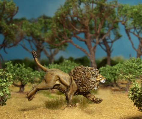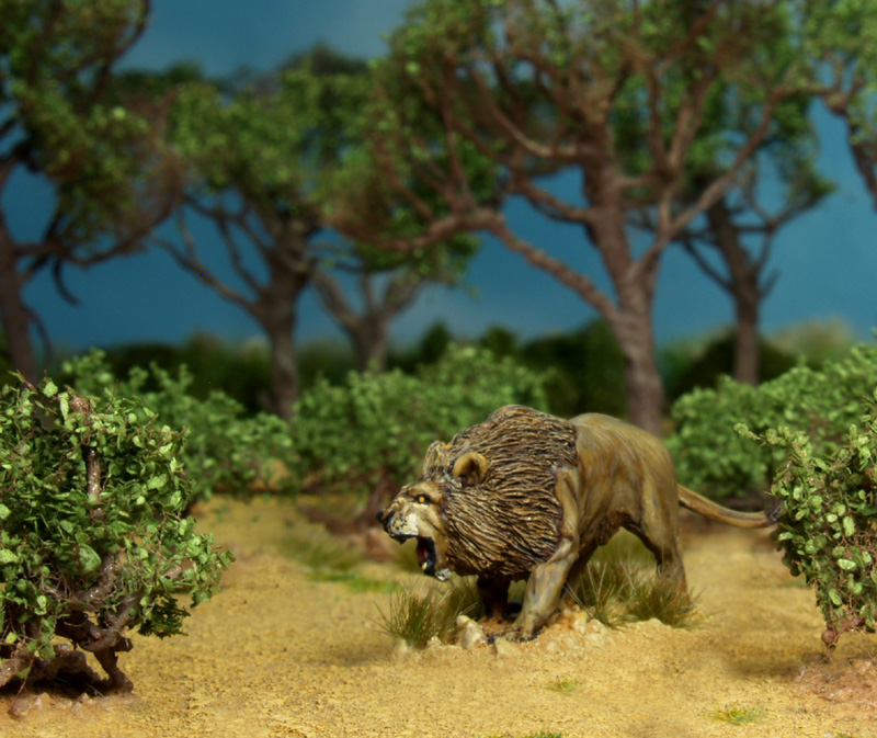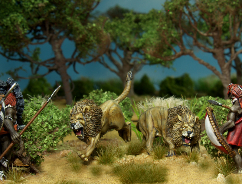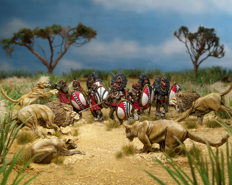 Die Figuren der Massai stammen natürlich aus der legendären Darkest Africa Reihe von Foundry. Die Löwen habe ich vom relativ unbekannten Hersteller Primaeval Designs erworben. Die Löwen auf dem letzten Foto sind von Reaper.