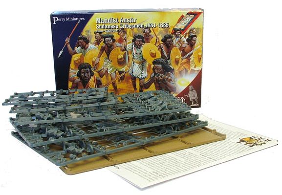 Das Set “SA 30 Mahdist Ansar – Sudanese Tribesmen 1881-1885” enthält 40 Multipose-Figuren, die man komplett als Beja oder Nil-Araber / Baggara zusammenbauen kann. Die Figuren können wahlweise mit Speeren, Schwerter und Wurfhölzern oder mit Gewehren ausgestattet werde. Optional sind auch die Schilde und einige verschiedene Armvarianten. Zusätzlich enthält das Set eine Option für je zwei Fahnenträger, Musiker und Anführer. Wie auch in den anderen Perry Sets, enthält die Box einen Gussast mit Basen und ein kleines Heftchen mit einer Bemalanleitung und dem historischen Hintergrund er Figuren. Es sind auch farbige Fahnen beigelegt, die man ausschneiden und mit den Figuren verwenden kann.