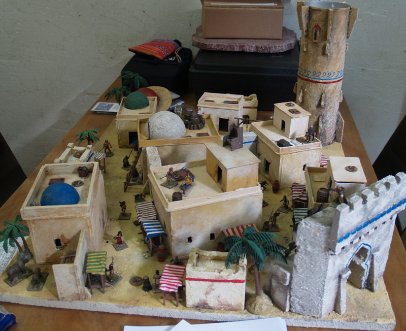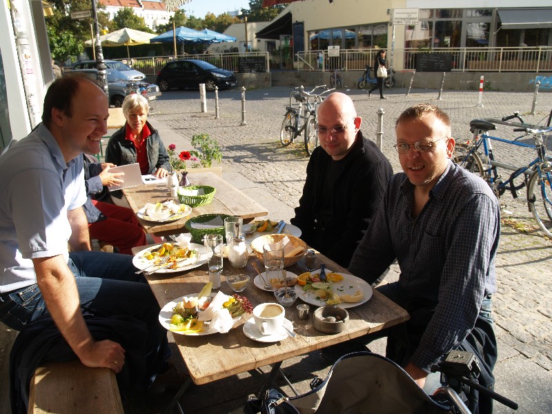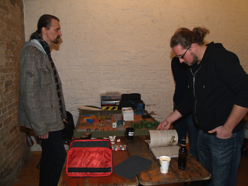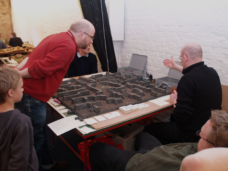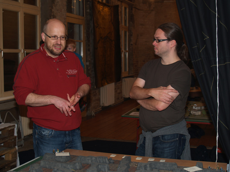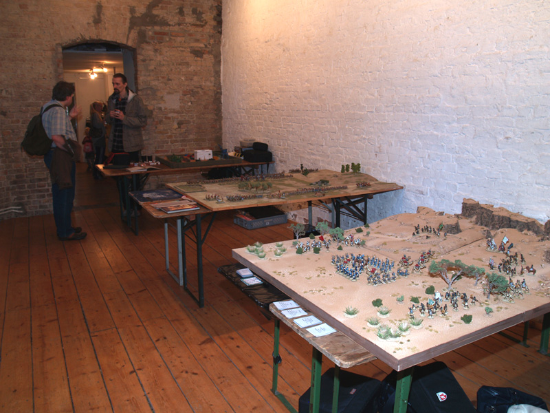 Am Wochenende fand nun zum 2. Mal das Berliner Wargaming-Treffen, die BEST (Berliner-Spiele-Treff), statt. Für mich der erste Besuch dieser Veranstaltung. Wir, das waren Frank Bauer, Vasa und ich, starteten schon am Freitagmorgen in Richtung Landeshauptstadt. Wir (zumindest Vasa und ich…Frank Bauer hatte sich nach Postdam abgesetzt) hatten uns in einem der zahllosen Hostels in Kreuzberg eingemietet und konnten auf Grund der frühen Anreise gleich mal die Gegend unsicher machen. Zunächst gab es eine kleine Stärkung beim Syrer an der Ecke…Falafel, Humus, Salat und Fladenbrot…oberlecker und kleiner Preis! Dann ging es zum Battlefield Berlin, dem ultimativen Wargaming- Mekka dieser Region. Hier ließen wir ein paar Taler zurück und erhielten im Austausch einige nützliche Utensilien. Mit den schweren Einkaufstaschen ging es wieder zurück nach Kreuzberg. Kaum angekommen öffneten dort auch schon die Tore der BEST und wir konnten unsere Siebensachen aufbauen. Am Abend ging es zur Oranienstraße und dort in ein großartiges Indisch-Thailändisches Restaurant. Nach ein paar Bierchen und Cocktails hatte ich dann auch die nötige Bettschwere. Am nächsten Morgen hatten wir uns mit Marc, Dirk und Oliver zum Frühstück im Marx verabredet. Bei bestem Wetter wurde dort ein opulentes Mahl verdrückt und wir waren bereit zu großen Taten. Neben unseren „Hamburger Tischen“ (FoG – Punischer Krieg, Sharpe Practice – Sudan und This very Ground – Samuari) gab es das wunderschöne Dungeon von Maik, ein Römer-Kelten Impetus Spiel von Marc (und Olivers Figuren), ein klasse Conan-Skirmish von Oliver, eine grandiose 20mm Platte von xothian und HeinzKnitz…hier wurde Force-on-Force gespielt und eine Platte auf der Malifaux gezockt wurde. Nach einem kurzen Gemetzel gegen die Sieben Samurai, kämpften sich meine Elfen durch die Tiefen eines furchterregenden Gewölbes, wo ich mit Hilfe einige Werwölfe ein paar Dunkelelfen und Vampire erledigen sollte. Zusammen mit Marc und Maik habe ich dann einen kleinen Fußmarsch zum nahegelegenem neuen Shop von Modular (DEM Laden für Architekturmodellbau) unternommen. Hier kann man auf 5.000 m2 alles erwerben, was man so zum Geländebau benötigt. Der Rückweg machte hungrig und so ging es in ein persisches Restaurant…mit recht ungewöhnlichem Essen. Am Nachmittag und Abend habe ich noch ein sehr unterhaltsames Sudan – Spiel geleitet und unter Anleitung von Marc ein paar Ömer verkloppt. Nicht unerwähnt, sollte auch das großartige Diorama von Dirk bleiben, der mit seinen französischen Kürrasieren und einem Braunschweigern Karree einen echten Hingucker aufgestellt hatte. Auch am Abend gab es wieder einen Besuch in einem Restaurant um Ecke…dieses Mal ein Grieche mit sehr leckeren Calamari. Am Sonntag ging es ans einpacken und auf Grund des Marathons dann mit reichlich Verspätung zurück in die Heimat. Die Veranstaltung war wirklich sehr schön und man hat wieder reichlich nette Leute getroffen. Neben den Spielen und netten Gesprächen hat mir auch das „Kreuzberg-Flair“, sowie meine kulinarische Reise sehr viel Spaß gemacht. Negativ war eigentlich nur, dass so wenige Berliner gekommen sind…da gibt es sicher noch Ausbaumöglichkeiten (wie Vasa sagen würde). Ich komme aber gerne wieder und sage schönen Dank an die Veranstalter!