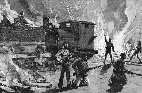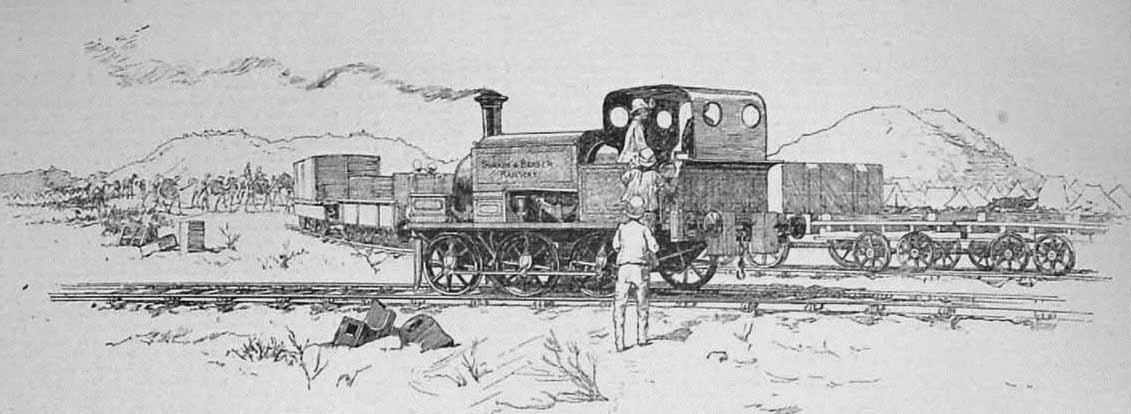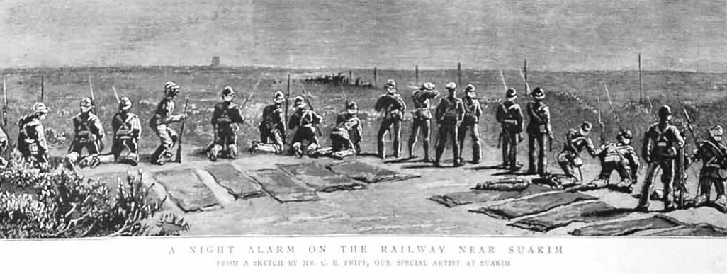 Zur gleichen Zeit gab es zahlreiche nächtliche Überfälle auf die Bahnlinie. Die Ansar setzten die hölzernen Schwellen in Brand und zerstörten die Telegraphenkabel. Mit dem langsamen Abzug der Truppen im Mai 1885 wurde die Situation an der Bahnlinie zunehmend schwierig. Ein gepanzerter Zug patrouillierte nun jede Nacht um die feindlichen Stämme abzuwehren. Die Zugmaschine wurde in die Mitte von einigen offnen Güterwagen gestellt. Die Wagen wurde zur Verteidigung mit einer Brustwehr aus Metallplatten ausgerüstet. Der Zug wurde mit 30 Männern und einem Offizier besetzt, wobei die Soldaten neben ihren Waffen auch Hacken und Schaufel mit sich führten, um Notfalls die Strecke sofort reparieren zu können. An der Vorderseite der Lokomotive wurde später auch ein Suchscheinwerfer befestigt.