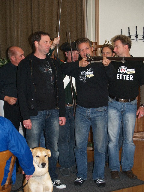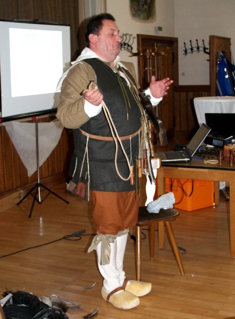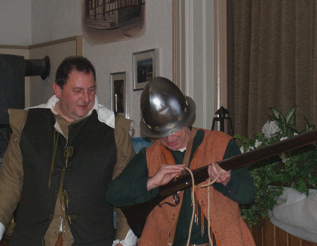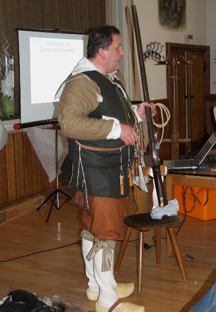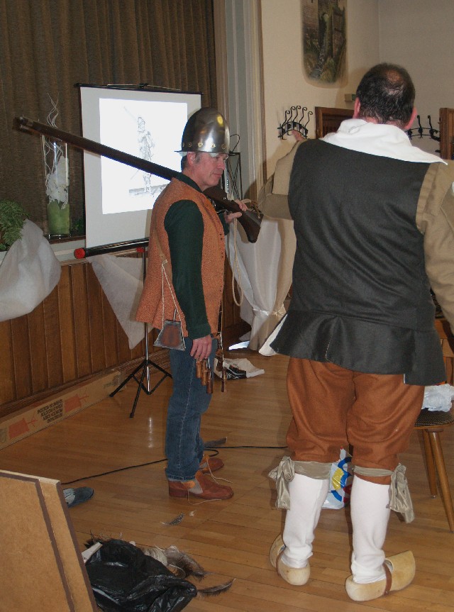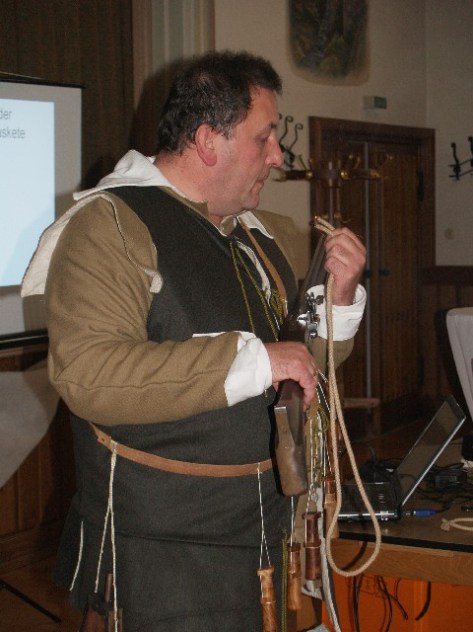 Jens schlüpfte in das Gewand eines Musketiers des 30-jahrigen Krieges, erläuterte das Erscheinungsbild und demonstrierte die Funktionsweise der Luntenschloßmuskete.