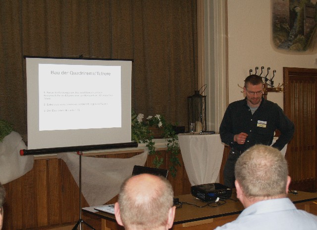 Frank erläuterte die Konstruktion, den Bau und den geschichtlichen Hintergrund der griechischen Triere, seinem derzeitigen Modellbauprojekt.
