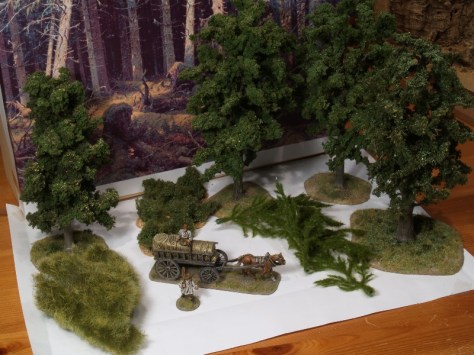 Bei aufwendigen Bildern verwende ich eine ganze Reihe von Geländeteilen und kleinem Zubehör. Zunächst nehme ich als Untergrund eine meiner Spielplatten oder verwende Geländestreu bzw. Geländematten. Anschließend werden verschiedene Gegenstände (je nach Motiv) im Vordergrund und im Hintergrund platzieren, dass vermittelt Tiefe und die Darstellung erscheint realistischer. Man muss das Ganze nicht als perfektes Diorama arrangieren. Man sollte immer daran denken, aus welcher Perspektive später fotografiert wird. Oft reicht es, einige Geländeteile geschickt hintereinander und überlappend anzuordnen, um den gewünschten Effekt zu erzielen. Da du nur aus einer Richtung fotografierst, muss der ganze Aufbau auch nur aus dieser Blickrichtung zu einem Bild verschmelzen, ähnlich wie bei einem Filmset oder einer Theaterkulisse.