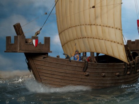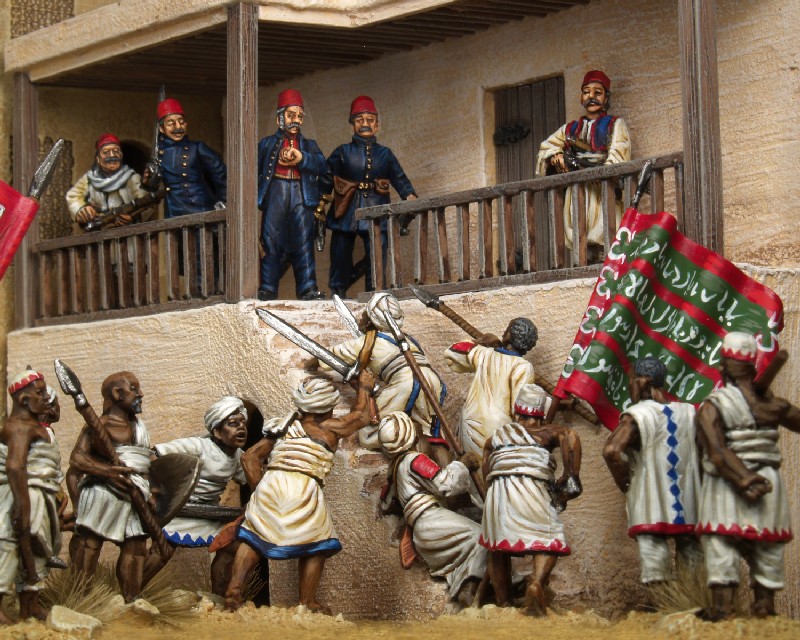 Ein guter Tipp für die richtige Perspektive ist dieser: stell dir vor, du bist genauso groß wie eine Figur und stehst mit deiner Kamera mitten unter den Miniaturen, was würdest du sehen? Zunächst versuche ungefähr mit dem Objektiv auf Augenhöhe mit den Figuren zu bleiben. Bei Reitern, Elefanten, Figuren die erhöht, wie z.B. auf Mauern stehen, geh in die Froschperspektive, d.h. du platzierst die Kamera unterhalb der Augenhöhe der Figuren. Es sind auch Aufnahmen aus der Vogelperspektive möglich, dann braucht das Auge allerdings einen Bezugspunkt im Bild, der die Position der Kamera plausibel erläutert. Das könnte die Andeutung einer Klippe, Treppe, Mauer, Baum usw. oder der Teil eines Flugzeuges sein. Auch hier stellt man sich wieder vor, dass man selbst irgendwo erhöht positioniert ist und auf das Geschehen herunterblickt.
