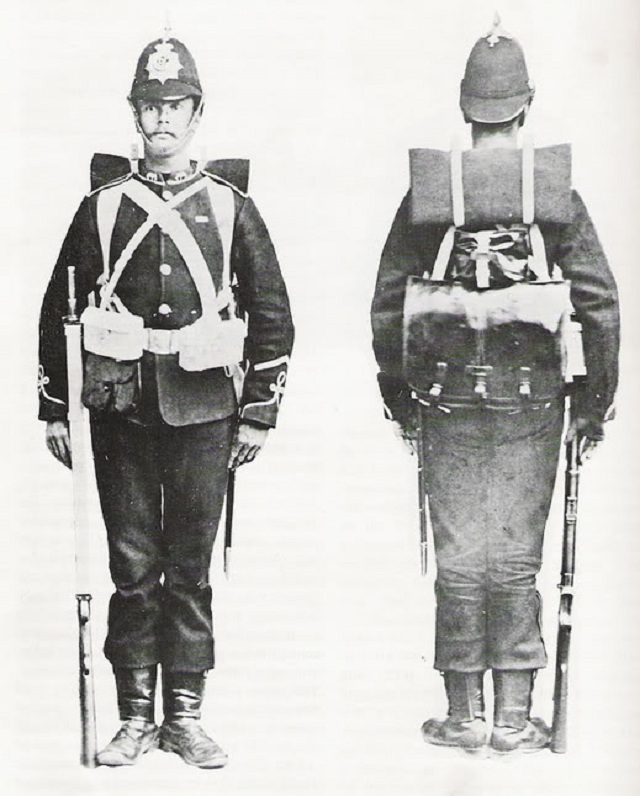 Dieses Foto von 1885 zeigt einen Soldaten des New South Wales Kontingent nach seiner Rückkehr aus dem Sudan. Er trägt die in Suakin ausgegebene Khaki-Uniform und Segeltuchgamaschen. Gut erkennbar ist auch das P1882 Koppeltragegestell mit den neuen größeren Patronentaschen.Der Einsatz im Sudan