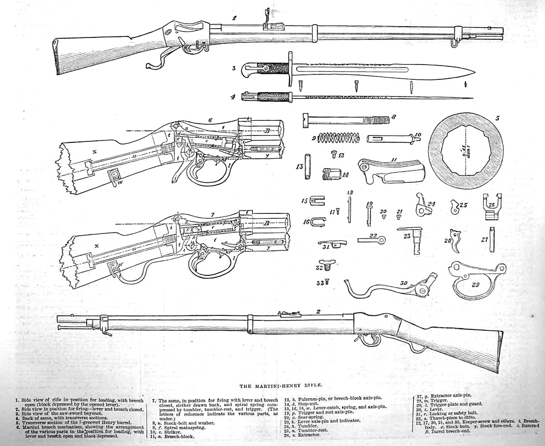 Das Gewehr konnte mit dem P1876 „Lunger“ Bajonett ausgerüstet werden, das eine Länge von 22 inch und eine dreikantige, konische Form hatte. Neben diesem Bajonett erhielten die höheren Unteroffiziersränge der Linienregimenter und alle Dienstgrade der Schützen-Regimenter das P1860 Schwert-Bajonett (allerdings eine geänderte Version, um mit dem neunen Martini-Henry verwendet werden zu können). Die 22 ¾ Inch lange Klinge hatte eine doppelte Krümmung, wodurch dieses Modell auch seine inoffizielle Bezeichnung „Yataghan“ erhielt. Dieses Schwert-Bajonett wurde außerdem standardmäßig an die berittene Infanterie ausgegeben. Die Bajonette gaben häufig Anlass zu Kritik, da sie meist aus sehr weichem Eisen gefertigt waren und so oft verbogen. Es gab haarsträubende Geschichten, bei denen von Bajonetten berichtet wurde, die sich im Körper des Gegners so verbogen und der Soldat gezwungen war den toten Feind erst ein paar Meter hinter sich herzuziehen, bevor er seine Waffe wieder herauswinden konnte.