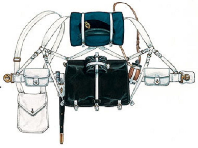Dieser Soldat von 1879 trägt das P18070 Koppeltragegestell und die volle Ausrüstung. Gut erkennbar in der Frontansicht ist die schwarze Kugeltasche unter der rechten Patronentasche.Koppeltragegestell