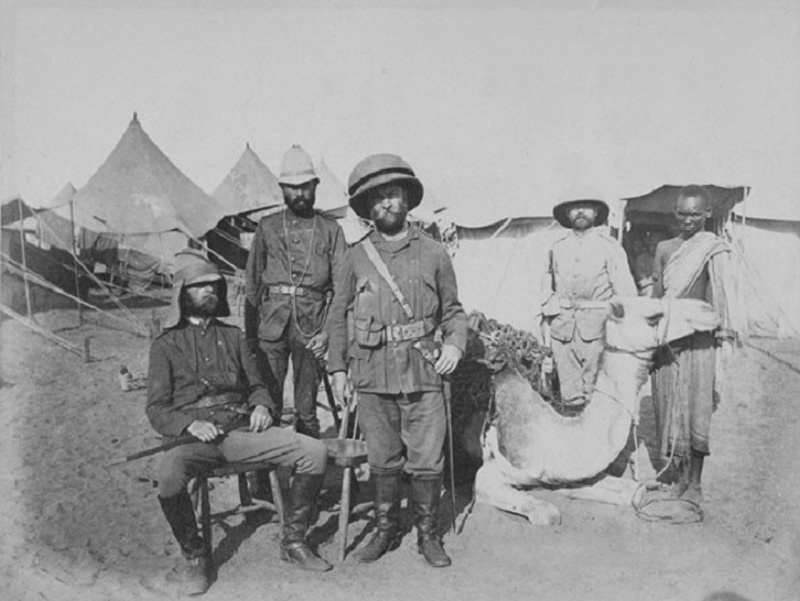 Die Aufnahme zeigt Offiziere einer Commissariat and Transport Company 1885 im Lager bei Suakin. Die beiden vorderen Offiziere tragen verschiedene Versionen des Sam Brown Belt. Im Hintergrund ein Soldat in grauer Uniform und mit Sonnenhut.Rückentasche