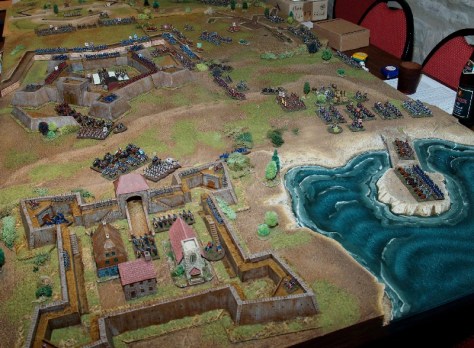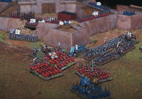 Die Kurpfälzer und vor allem Jürgen waren wie immer mit einer großartigen Spielplatte, unglaublichen Massen an Figuren und einem hervorragendem Szenario vertreten. Bei einer Belagerung zur Zeit des Spanischen Erbfolgekrieges konnte man in die Rolle des Angreifers oder Verteidigers einer Vauban-Festung schlüpfen. Gespielt wurde in 10mm und nach einem eigenen, einfachen Spielsystem, bei dem die Kampfmechanismen aus DBA verwendet wurden. Zusätzlich bekam jeder Spieler eine Anzahl von Ereigniskarten, die jederzeit im Spiel eingesetzt werden konnten. Die Belagerung wogte hin und her und es war bis zum Schluss unklar, wer triumphieren würde. Großartig!