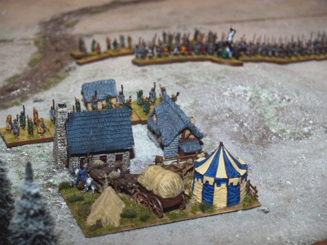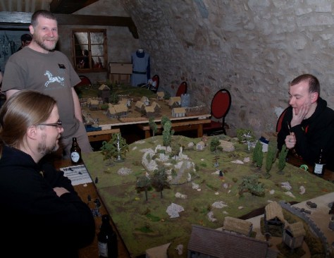 Gero hatte sich die Mühe gemacht, ein Szenario für Field of Glory zu entwickeln. Gespielt wurde die recht unbekannte Schlacht bei Weseberg (im heutigen Estland). Dort trafen an einem kalten Februartag das Heer deutscher Ritter und dänischer Verbündeter unter der Führung von Otto von Lutterberg auf ein russisches Bündnisheer, kommandiert von Michail Fjodorowitsch, Daumantas von Pskow und dem Großfürst Dmitri Alexandrowitsch, dem Sohn Alexander Newskis. Ich hatte die ehrenvolle Aufgabe einige estnische Knechte, welche als Kanonenfutter für das deutsch-dänische Heer dienen sollten, in die Schlacht zu führen. Stefan ritt derweil mit der dänische Blüte des Mittelalters in Tod und Verderben. Trotz der recht eindeutigen Niederlage war es ein interessantes Spiel und wir hatten jede Menge Spaß. Die schönen Figuren hatten übrigens Frank Bauer, Jürgen und Stefan beigesteuert.