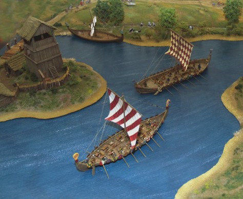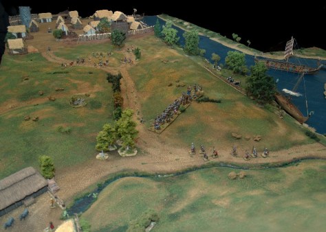 Diese gigantische Spielplatte habe ich zwar nicht bespielt aber dafür lange bewundert. Frank Bauer, mit seinem Hang zu Großprojekten, hat mal wieder eine unglaubliche Spielplatte kreiert. Sehr beeindruckend sind auch die Anzahl und die wunderbare Bemalung der Langboote. Die Hammaburg selbst wurde von Thomas Hahn gebaut und der größte Teil der Figuren stammt von Patrick, der auch für das Szenario und Regelwerk zuständig ist. Der Angriff der Wikinger, der nebenbei auch mit dem Trinken von viel Met begangen wird, ist in zwei Szenarien gegliedert. Zunächst kämpfen die wilden Nordmänner auf einem offenen Schlachtfeld vor den Toren der Hammaburg. Dieses erste Aufeinandertreffen wird mit dem Regelwerk Clash of Empires ausgetragen. Danach folgt der Sturm über den Wall und die Plünderung der Siedlung. Dieses Skirmish-Szenario wird mit den relativ neuen SAGA Regeln bestritten. Die Präsentation bietet also eine gute Gelegenheit, diese beiden neuen Regelwerke einmal zu testen.