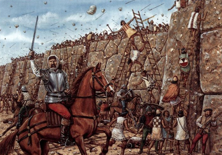Die spanischen Eroberer kamen erstmals im Jahr 1528 mit dem Inkareich in Berührung. Zeitgleich wütete unter der Indio-Bevölkerung eine Pockenepidemie, der auch der oberste Inka Huayna Capac erlag, worauf ein blutiger Bürgerkrieg um die Nachfolge entbrannte. Anfang 1530 segelte Francisco Pizarro mit einer kleinen spanischen Flotte und rund 180 Männer nach Südamerika und ging dort in Ecuador an Land. Nach Gefechten an der Küste und einigen Strapazen erreichte die kleine Streitmacht am 14. November 1532 die Stadt Cajamarca. Hier lagerte der mittlerweile siegreich aus dem Bürgerkrieg hervorgegangene Atahualpa mit 30.000 seiner Krieger. Der Inka wurde von den Spaniern unter dem Vorwand von Verhandlungen in einen Hinterhalt gelockt und gefangengenommen. Man Versprach die Freilassung Atahualpas gegen die Aushändigung von Gold und Silber, dass im Gegenzug seine Gefängniszelle füllen sollte. Doch als das Gold gezahlt worden war, weigerten sich die Spanien den Inka freizulassen und ließen ihn kurze Zeit später hinrichten. 1533 marschierte Pizarro gegen Cuzco, die Hauptstadt des Inka-Reiches, die in einer Höhe von 3.416 Metern an den westlichen Hängen der Anden liegt. Die hier ansässigen Adligen waren im Bürgerkrieg Gegner Atahualpas gewesen und so kam es zunächst zu einem friedlichen Zusammenschluss zwischen Inka und Spaniern. Doch die Gier nach Gold war zu groß. Pizarro ließ Cuzco und die Umgebung nach und nach ausplündern. Zur Verschiffung des Goldes wurde an der Küste die neue Hauptstadt Lima gegründet.
