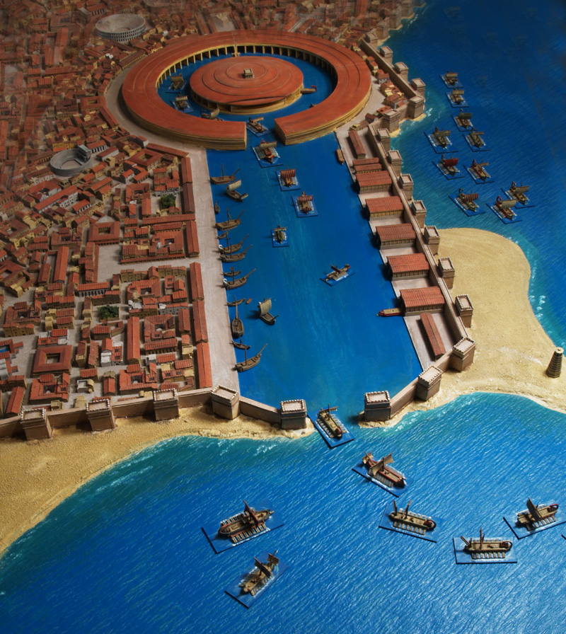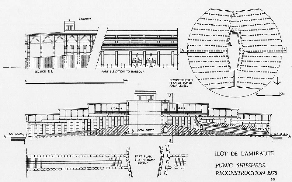 Zunächst aber einige kurze geschichtliche Erläuterungen. Der vermutlich weltgrößte Hafen des 3. Jahrhunderts v. Chr. war der von Karthago. Es handelte sich um einen Doppelhafen, geteilt in einen Handelsbereich und eine militärische Anlage. Der griechische Historiker Appian beschreibt die Anlage in seinen Aufzeichnungen, die vermutlich auf verlorengegangene Abschnitte der Historien von Polybius basieren. Dem Kriegshafen vorgelagert befand sich zunächst der reckeckige Handelshafen, mit einem Hafenbecken von 150 Meter Breite und rund 400 Meter Länge. Die Zufahrt vom Meer in den Hafen hatte eine Breite von 20 Metern und könnte im Notfall durch eine eiserne Kette gesichert werden. Auf der westlichen Seite lag der Pier mit den Lagerhallen, auf der Ostseite die Werften und Bootshäuser. Geschützt wurde die gesamte Anlage durch eine mächtige Festungsmauer, die in regelmäßigen Abständen von großen Türmen unterbrochen wurde. Der Zugang zum Kriegshafen erfolgte ausschließlich durch den Handelshafen.
