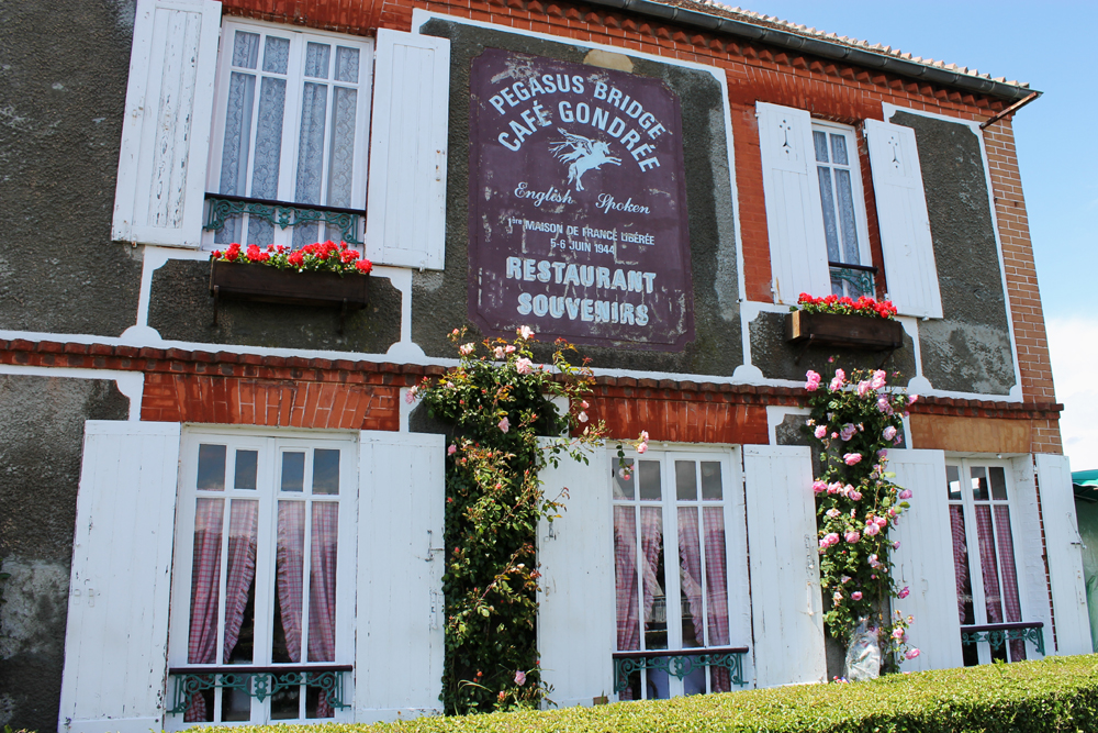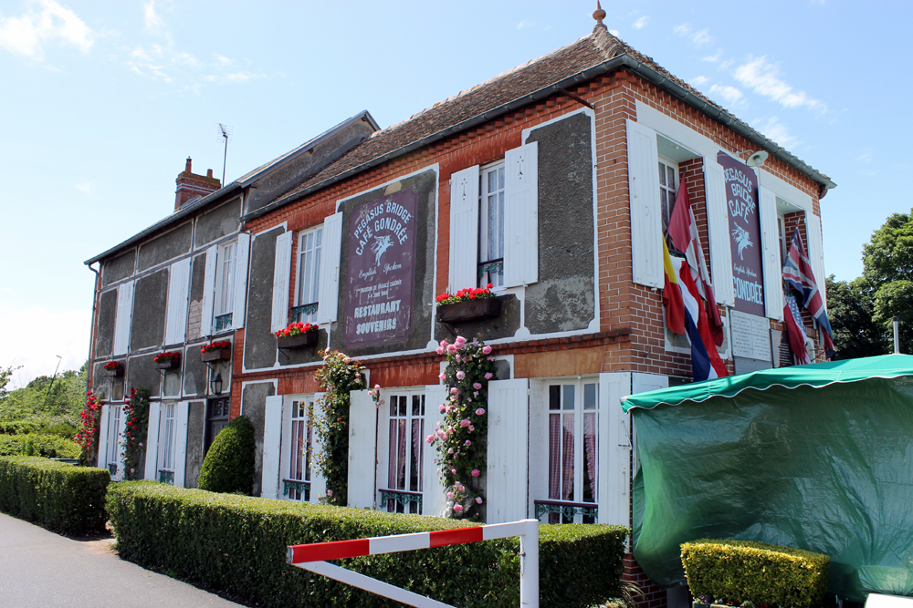Das Café Gondree befand sich auf der Westseite der Brücke, unmittelbar südlich der Straße. Damals wurde das Café von Georges und Thérèse Gondree betrieben. Beide waren Mitglieder der Résistance und gaben über Mittelsmänner Informationen über die Verteidigungsanlagen der Brücke an die Briten weiter. Das Cafe diente zeitweise auch als Straßenbahnstation, bis der Verkehr eingestellt wurde. Bei den Kämpfen um die Brücke hielten sich Georges und Thérèse mit ihren Töchtern Georgette, Arlette, und der Neugeborenen Françoise im Cafe auf. Das Café gilt im Rahmen der Normandie Ladung als erstes befreites Haus Frankreichs. Nach der Brückeneroberung diente das Cafe als Sanitätsstelle. Heute wird das nahezu unveränderte Café von der Tochter Arlette betrieben und ist ein Muss jeder Normandie-Tour. Im engen, urgemütlichen Gastraum mit dem alten Tresen, kann man sich mit einen Kaffee und Baguette stärken und die alten Fotos und Erinnerungsstücke bestaunen.