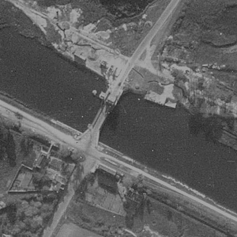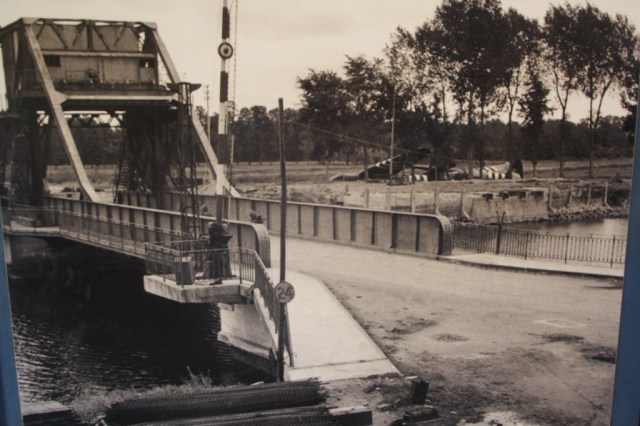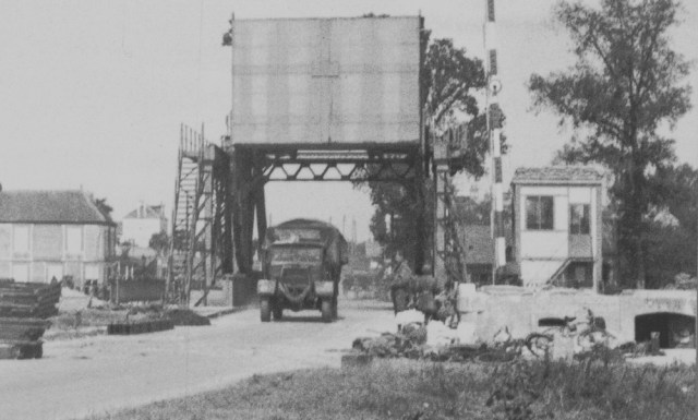 5. Auf der Ostseite der Kanalbrücke hatte man einige Häuser eingerissen. Hinter dem MG Bunker stand jedoch ein kleiner Turm und dahinter ein größeres Gebäude.