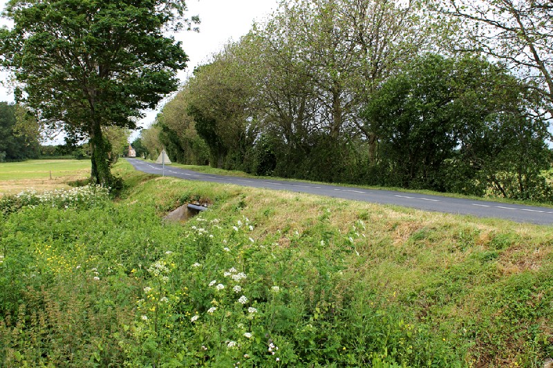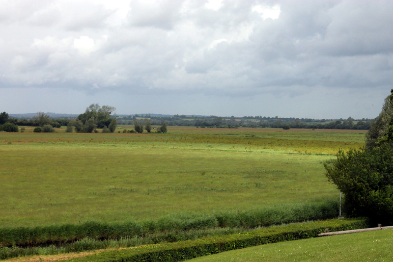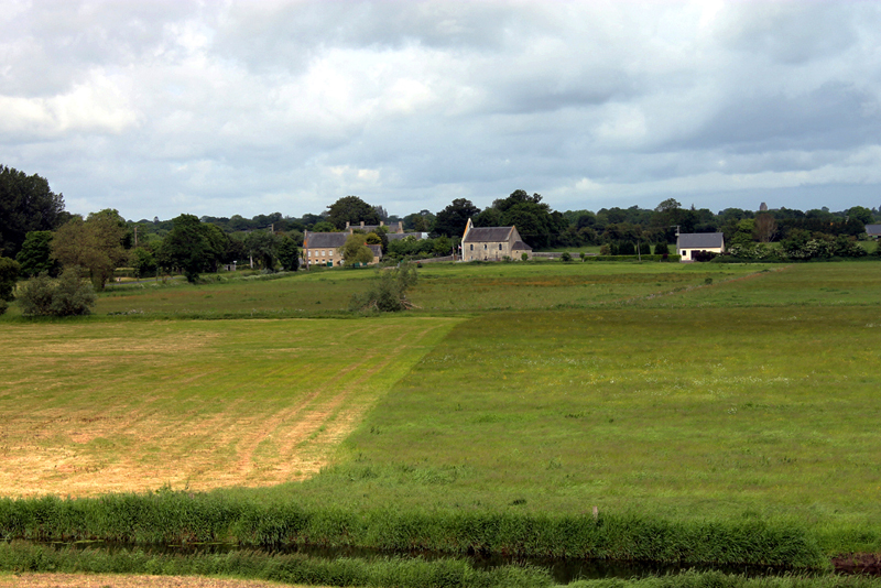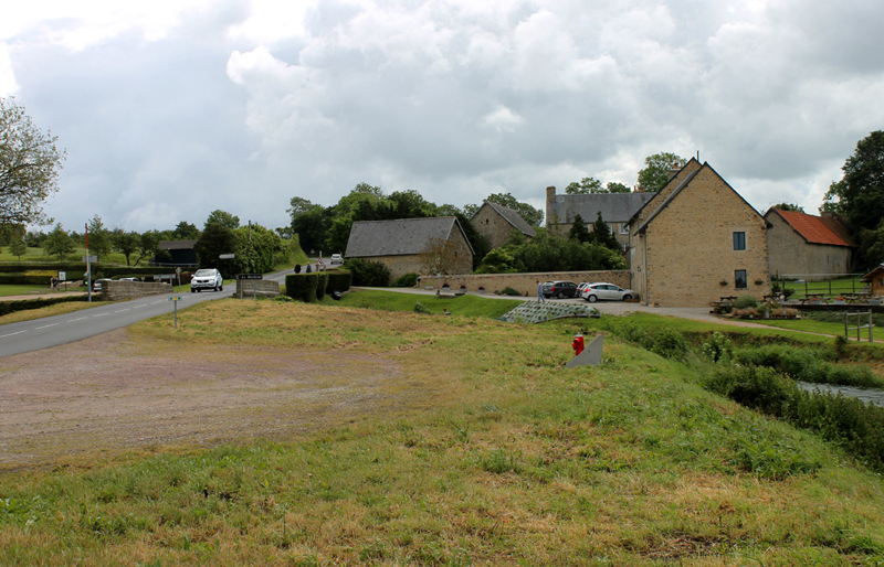 Brücke und La Fière Manor vom Dammweg aus gesehen. Man erkennt gut, wie die Straße hinter dem Hof leicht ansteigt.