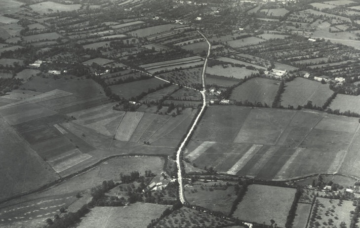 Dieser Blick nach Westen, zeigt La Fiere Manor am unterem Bildrand, daneben die Brücke und den kleinen Fluss Merderet. Die Felder links und rechts der Straße waren bis zu den nächsten Gebäuden, dem Ort Cauquigny überflutet worden.