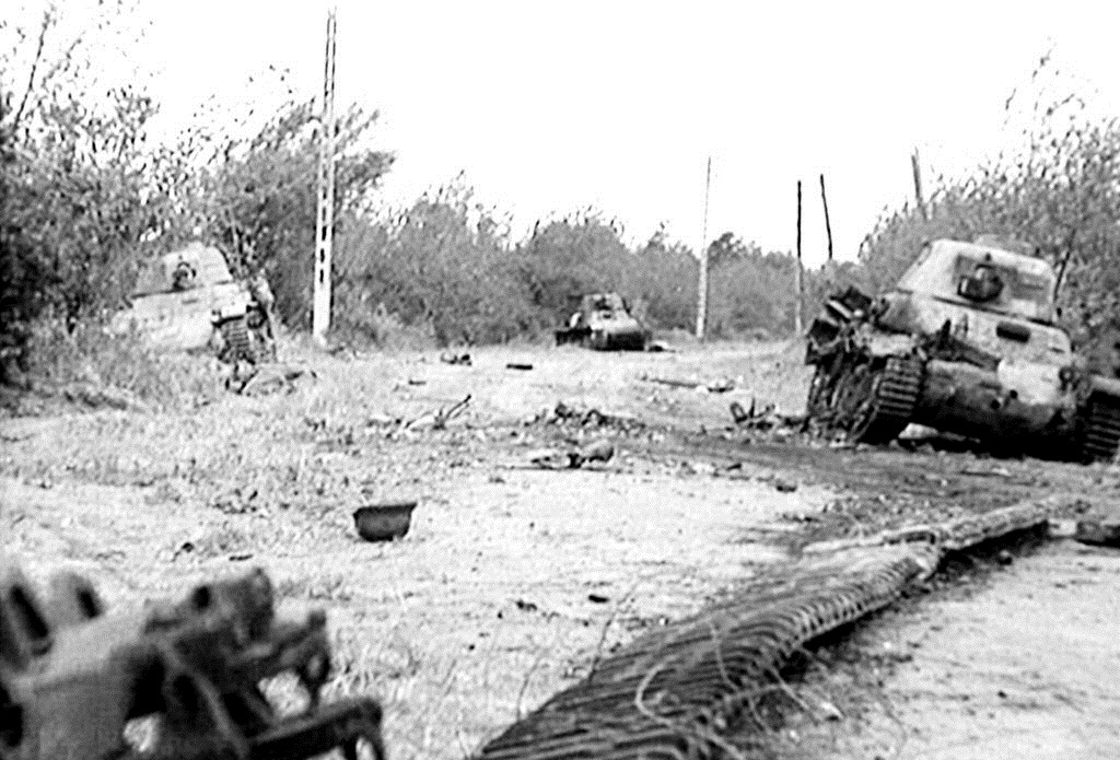 Auf diesem Bild sind die 4 zerstörten Panzer auf dem Dammweg zu sehen. Rechts und Links die R35 in der Bildmitte der H-39 und im Vordergrund die Ketten des PzKpfW III.