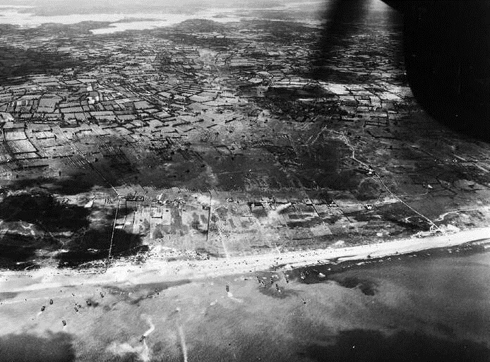 Dieses alte Foto zeigt die Landung am Abschnitt UTAH. Am oberen Bildrand, sind gut die Überflutungsgebiete des Merderet Flusses zu erkennen.
