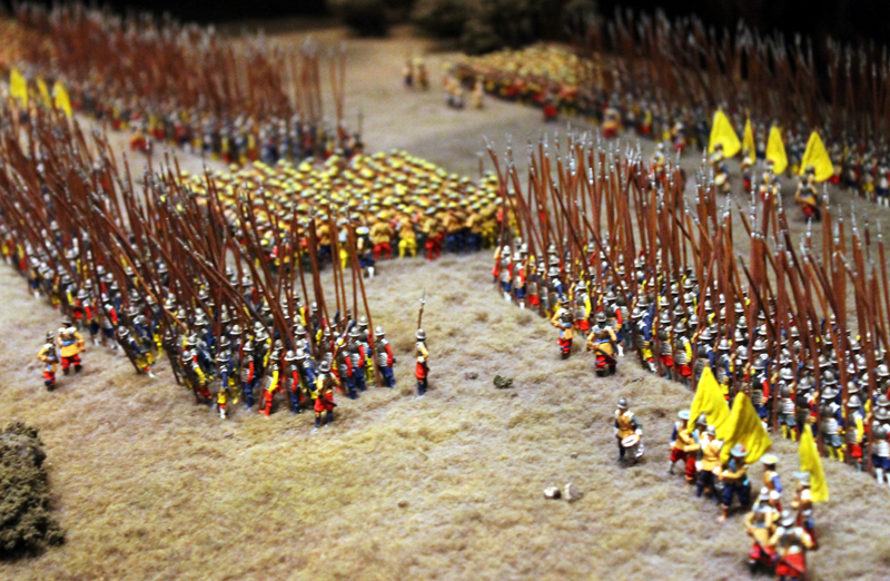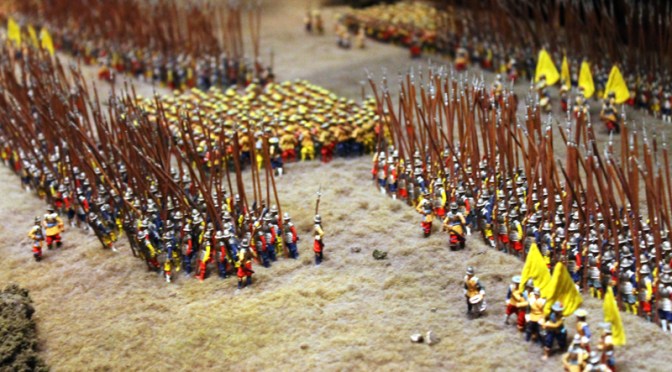 Dieses Bild zeigt die eine Hälfte des großen Zinnfiguren Dioramas einer kleinen schwedischen Armee. Insgesamt besteht die Szene aus 5.800 Figuren.