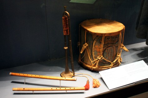 Trommler und Pfeifen der Infanterie und eine Kavallerie-Trompete aus der Zeit des großen Nordischen Krieges.