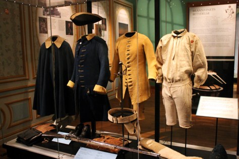 Ausrüstung eines Fußsoldaten um 1690. Hier sieht man die erste, allgemein verwendete Uniform der schwedischen Armee. Daneben sind Degen und Luntenschlossmuskete, die Waffen der Infanterie zu sehen.