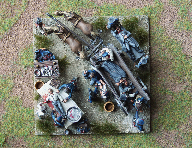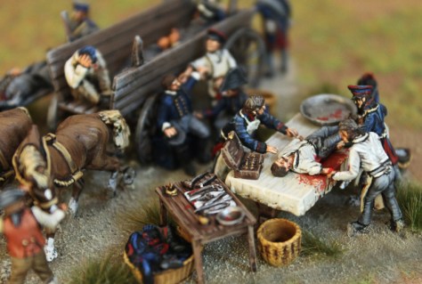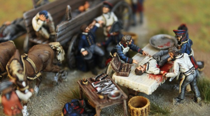 Dieser Preußische Verbandplatz aus der Zeit der Befreiungskriege im Maßstab 1/72 besteht ausschließlich aus Zinnfiguren von Art Miniaturen. Diese kleine Diorama verwende ich als „Line of Command“ für Spiele mit dem Regelwerk Field of Glory Napoleonic.