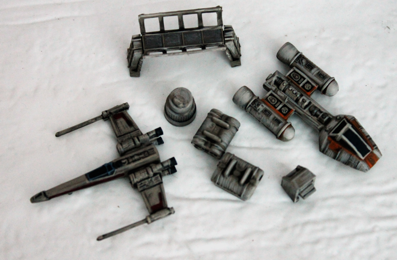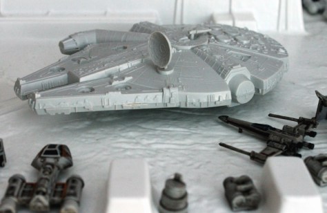 Ich habe natürlich sofort mal meine alten Bestände durchwühlt und nach passenden Ergänzungen gefahndet. Mir fiel dabei das alte „Rebel Base“ Szenario Set von AMT/Ertl in die Hände. Die Modelle sind zwar etwas größer (Maßstab 1/115) aber man erhält neben drei weiteren X-Wing auch noch drei Y-Wing, 4 Snowspeeder, den Rasenden Falken und einen Frachter! Zusätzlich, neben der Grundplatte, findet man noch ein bisschen Hangar-Gerödel und jede Menge Figuren. Die Miniaturen sind natürlich schon recht klein, haben aber trotzdem einen Wiedererkennungswert. Neben diesem Set, gab es noch ein weiteres, welches ebenfalls passen sollte. Es handelt sich um „Battle of Hoth“. Hier bekommt man zwar keine Raumschiffe geliefert, aber auch ein Kampf gegen die mächtigen AT-AT‘s ist bestimmt sehr spaßig. Neben diese beiden Sets sollen auch teilweise die alten Micro Machine Raumschiffe passen.