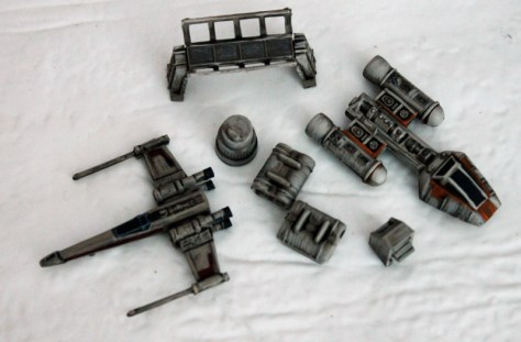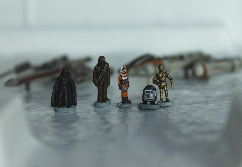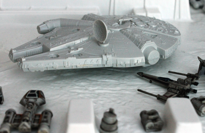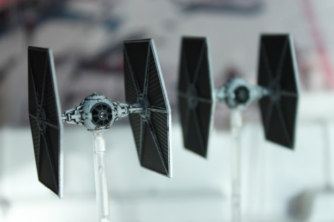 Das Grundregelwerk enthält neben den Regel und dem Spielmaterial auch drei bemalte Raumjäger. Eine X-Wing und zwei TIE-Fighter. Die Bemalung und Detaillierung der Modelle ist extrem gut. Der Maßstab der Schiffe liegt bei 1/270. Diese Schiffe und weitere Modelle kann man auch einzeln erwerben und so seine „Flotte“ individuell zusammenstellen. Bisher sind folgende Modelle erhältlich oder befinden sich kurz vor Auslieferung (bis Ende des Jahres):