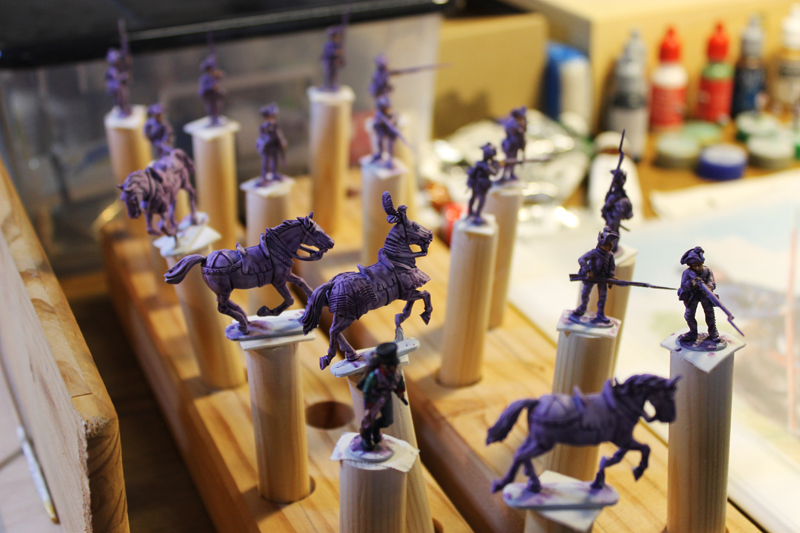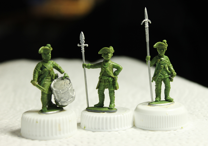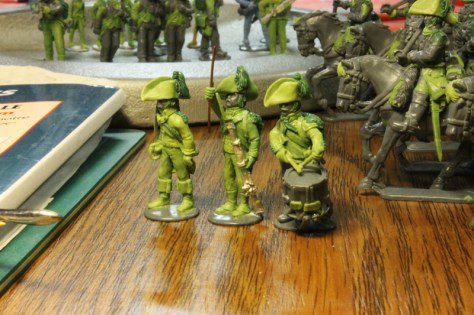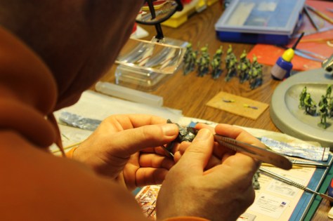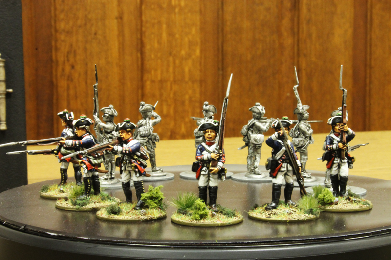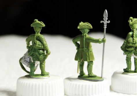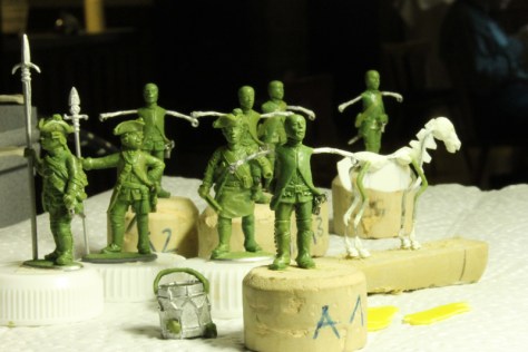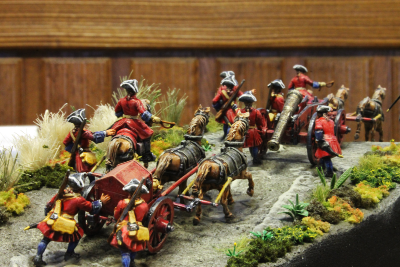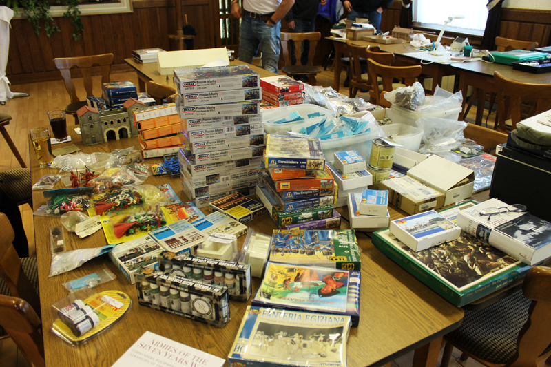Die Modelleure tummeln sich zwar am Rand des Geschehens, ihre Werke stehen aber oft im Mittelpunkt. Extrem eindrucksvoll sind die Arbeiten von Hans-Karl, der aus den Perry-Plastikfiguren seine Figurenträume wahr macht oder Frank Z., der emsig an seiner Figurenreihe der Burgunder-Kriege (1/72) modelliert. Den Vogel schießt aber natürlich Frank G. mit seinen Figurenreihe zum Thema „Preußen des 7-jährigen Krieges“ ab. Die kommenden Neuheiten dieser Serie, die von Black Hussar Miniatures (ebenfalls Teilnehmer des Symposiums) vertrieben wird, konnten schon eingehend bestaunt werde. Neben dem fertigen Kommandoset, gab es schon die ersten Schritte an den Artilleristen zu bewundern.