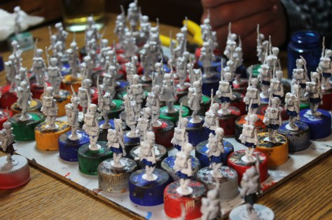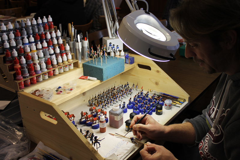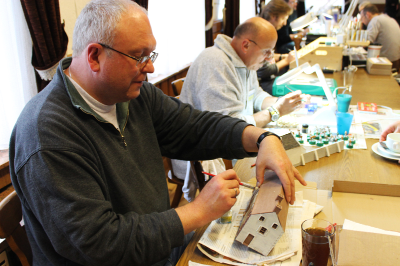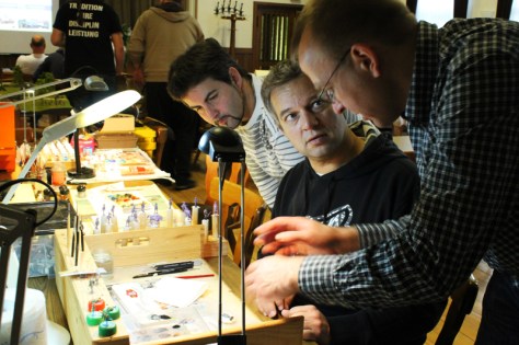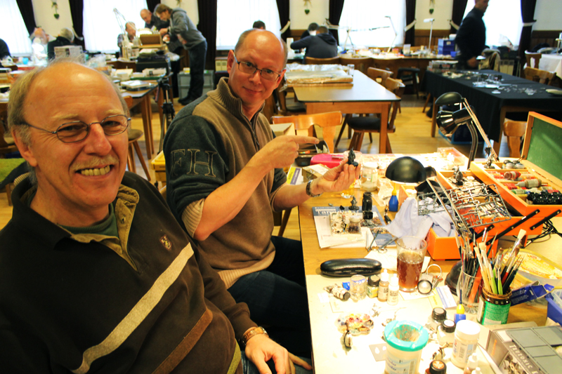 Im Zentrum des kleinen Saals stand wie in jedem Jahr der Arbeitsbereich der Maler. An den sehr individuellen Maltischen wurde fleißig gepinselt und man konnte den einen oder anderen Tipp oder Trick aufschnappen. Interessant der Hinweis von Klaus, wie man mit einem Transfer Medium Schriften auf sein Modell kopieren kann.