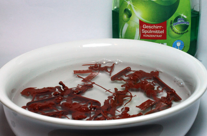 6. Vor dem Grundieren werden die Figuren nun in lauwarmem Wasser und mit einem Spritzer Spülmittel gereinigt. Anschließend sollte man die Miniaturen unter laufendem, kaltem Wasser abspülen. Die Figuren müssen nun gut trocken.