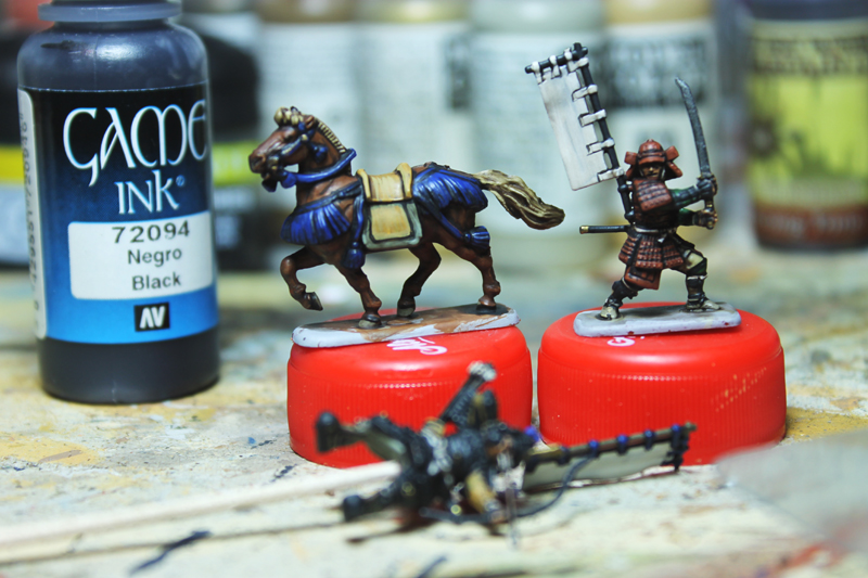 Um sich den ersten Arbeitsschritt der Schattierung zu sparen, gebe ich über den ersten, gut durchgetrockneten Farbauftrag nun etwas Tusche (Wash). Als Tusche oder Wash werden stark verdünnte Farben bezeichnet, denen oft Zusätze beigegeben werden, welche die Fließeigenschaften verbessern. Ich verwende fertiges braunes Wash (Strongtone /Armypainter) für Hautfarbtöne, alle Braun-, Grün, Gelb- und Rottöne, sowie Gold und Bronze. Bei Blautönen, Silber und Eisenfarbe greife ich zu schwarzem Wash (Games Workshop). Der Tusche gebe ich noch ein paar Tropfen Ochsengalle bei, um die Fließeigenschaft noch einmal zu verbessern. Die dünne Farbe läuft nun über die Figur, wobei sich die meisten Pigmente in den Vertiefungen sammeln und dort dunkle Bereiche, die Schatten der Figur, bilden. Man braucht zunächst etwas Erfahrung, um nicht zu viel oder zu wenig Tusche zu verwenden und diese auch in die richtigen Bereiche zu lenken. Mit einem trockenen Pinsel kann man überschüssiges Wash aufsaugen und so wieder problemlos entfernen. Durch den flächendeckenden Auftrag der Tusche werden auch die erhabenen Bereiche der Figur etwas abgedunkelt, ein Effekt, der durchaus gewollt ist. So entsteht ein sanfter Farbübergang zwischen den tiefen und den erhabenen Stelle der Miniatur. Wer etwas mehr Aufwand betreiben möchte, sollte nun die Schatten noch ein wenig durch verdünnte dunkelbraune bzw. schwarze Farbe verstärken.