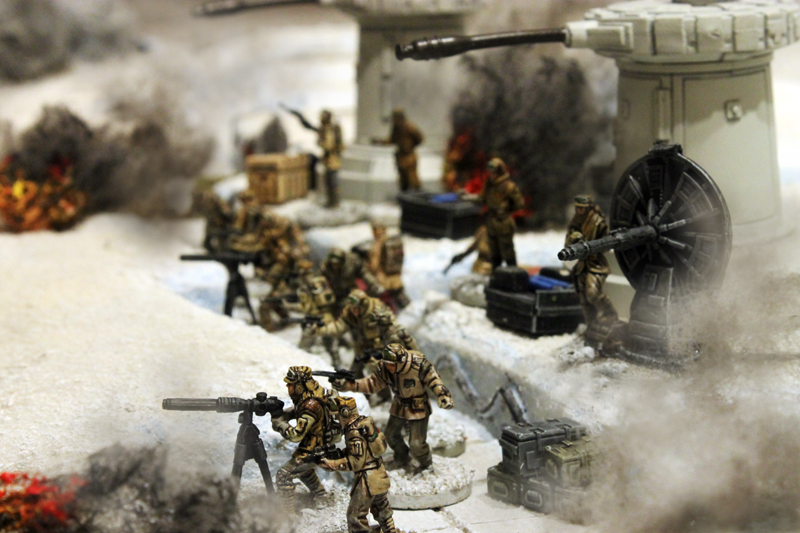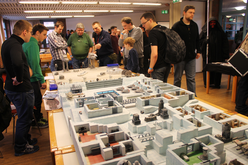 Diese riesige Spielplatte mit einer Gesamtlänge von 420 Zentimetern war schon 2011 das Highlight der TACTICA gewesen. Neben der gigantischen Echo-Basis mit einer Fläche von 4 Spielplatten, gab es zudem einen Außenbereich mit den Verteidigungsanlagen, sowie dem Schildgenerator des Rebellenstützpunktes. Die Anlage der Echo-Basis war in zwei große Hangar-Bereiche, Kommandozentrale, Unterkünfte, Medizinische Station, Ionenkontrolle, Wach- und Lagerräume, sowie zahlreiche Gangsysteme unterteilt. Es gab sogar einen Geheimgang! Der Clou der Anlage waren jedoch die komplett beweglichen Schiebetüren, die Frank Germershaus extra für diesen Zweck konstruiert hatte. In den Räumen der Basis fanden sich außerdem unzählige Einrichtungsgegenstände, wie Betten, Computerkonsolen, Schränke, medizinische Einrichtungen, Kisten und Kästen und jede Menge Raumschiffe und Hangar-Equipment. Vor den Toren dieser Anlage waren die massiven Verteidigungslasertürme aufgestellt und ein Grabensystem installiert worden. Zusätzlich waren hatte wir alle „prepainted“ – Figuren für dieses Spiel noch einmal neu bemalt.