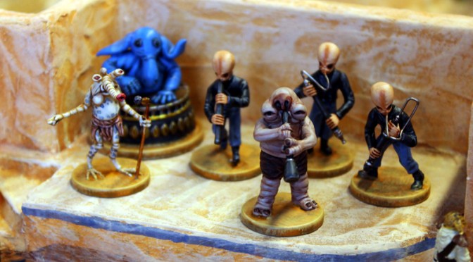 Diese brandneue Spielplatte von Frank Germershaus zeigt einen Teil des berühmt-berüchtigten Raumhafens. In der einen Ecke der Spielfläche befindet sich der Hangar mit dem Rasenden Falken, gegenüber hat die berühmte Chalmuns Cantina ihren Platz gefunden. Die Cantina ist natürlich komplett mit Bar und der legendären Max Reebo Band ausgestattet. Die Figuren der Band hatte Frank extra für diesen Anlass modelliert und wunderschön bemalt. Für mich das ganz große Highlight des Themenraumes! Der Rasende Falke, das Raumschiff des Schmugglers Han Solo, hat sogar einen bespielbaren Innenraum! Das geplante und im Rahmen der Tactica gespielte Szenario sah vor, dass Luke und Obi-Wan zusammen mit den Droiden R2-D2 und C-3PO die Cantina aufsuchen, um dort einen Piloten für den Flug nach Alderaan anzuheuern. Natürlich lauerten überall Spione des Imperiums und Sturmtruppen patrouillierten durch die Straßen der Stadt…also kein Spaziergang für die Mitspieler.