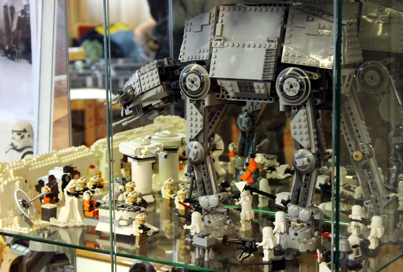 Natürlich soll auch die Ausstellungsbereich des Star Wars Themenraumnes nicht zu kurz kommen. An erster Stelle, sind da natürlich die Mitglieder des STAR WARS DINNER HAMBURG zu nennen. Hier gab es eine ganze Reihe unglaublicher Kostüme zu sehen, vor allem der Darth Maul machte mit einer unglaublichen Schminkarbeit und einigen eindrucksvollen Posen auf sich aufmerksam. Neben den Kostümen hatte die Leute vom Star Wars Dinner auch einen Ausstellungsbereich eingerichtet. Hier waren unter anderem beleuchte Raumschiffmodelle und eine große Sammlung an Lichtschwertern zu bewundern. In weiteren Vitrinen konnten die Besucher alte Bücher (z. B. mein Panini-Sammelalbum und der erste Roman von 1978), Bilder und eine große Sammlung Lego Star Wars, sowie Szenarien-Köpfen von MicroMachines bestaunen. Die Ausstellung zeigte außerdem eine Sammlung von Zinnfiguren der Firma West End Games, sowie TableTop- und Rollenspiel- Regelwerke.