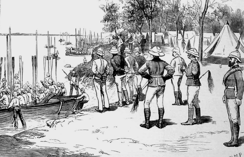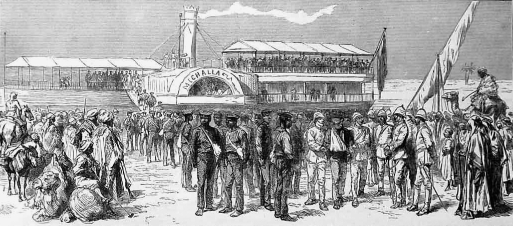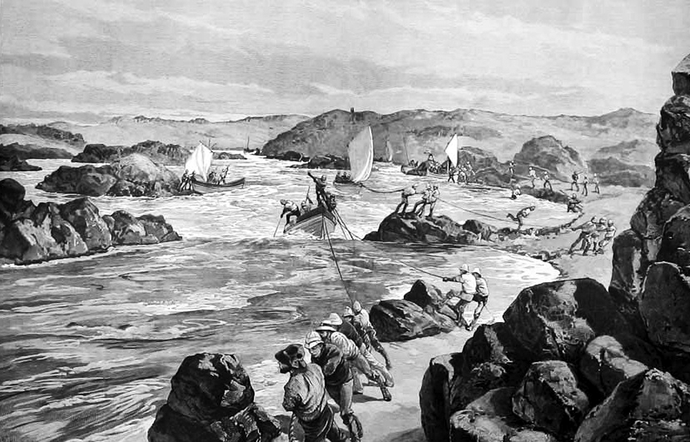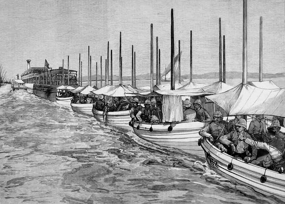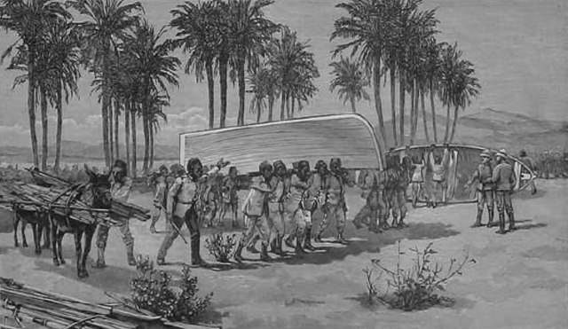 Der Aufbruch des South Staffordshire Regiments in Korti.Zunächst gab es eine Testfahrt mit 5 Booten unter der Führung von Major Dorward. Das Ergebnis war jedoch enttäuschend. In 27 Stunden konnten die Boote nur eine Strecke von 31 Meilen zurücklegen und das, obwohl alle Männer ständig an den Riemen und Seilen arbeiteten. 3 der Boote wurde zudem durch Steinen schwer beschädigt und mussten mit Platten aus Eisen und Blei repariert werden.