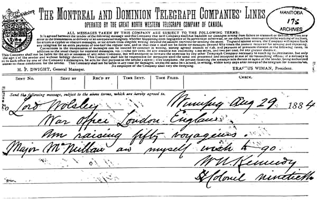 Das Eintreffen der Kroomen mit dem Schiff „Michalla“ in Wadi Halfa.Als Voyageurs wurden ursprünglich die Männer (fast ausschließlich französischer Abstammung oder Métis) bezeichnet, die Transportaufgaben im Pelzhandel in Nordamerika übernahmen. Da sich dieser Transport ausschließlich an lang der dortigen Flüsse bewegte, handelte es sich bei diesen Männer um sehr erfahrende Bootsführer. Nach der telegrafischen Anfrage des British Colonial Office vom 21. August 1884 an Lord Landsdown, dem kanadischen General Gouverneur, startete die Rekrutierung von kanadischen Voyageurs Der Premierminister Kanadas, Sir John Macdonald hatte keine Einwände, allerdings nur unter der Voraussetzung, dass Großbritannien alle Kosten für dieses Unternehmen tragen würde.