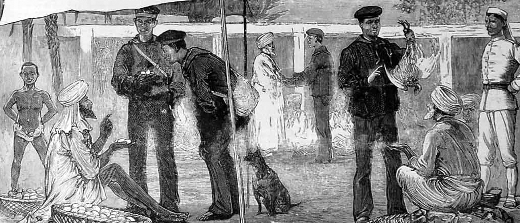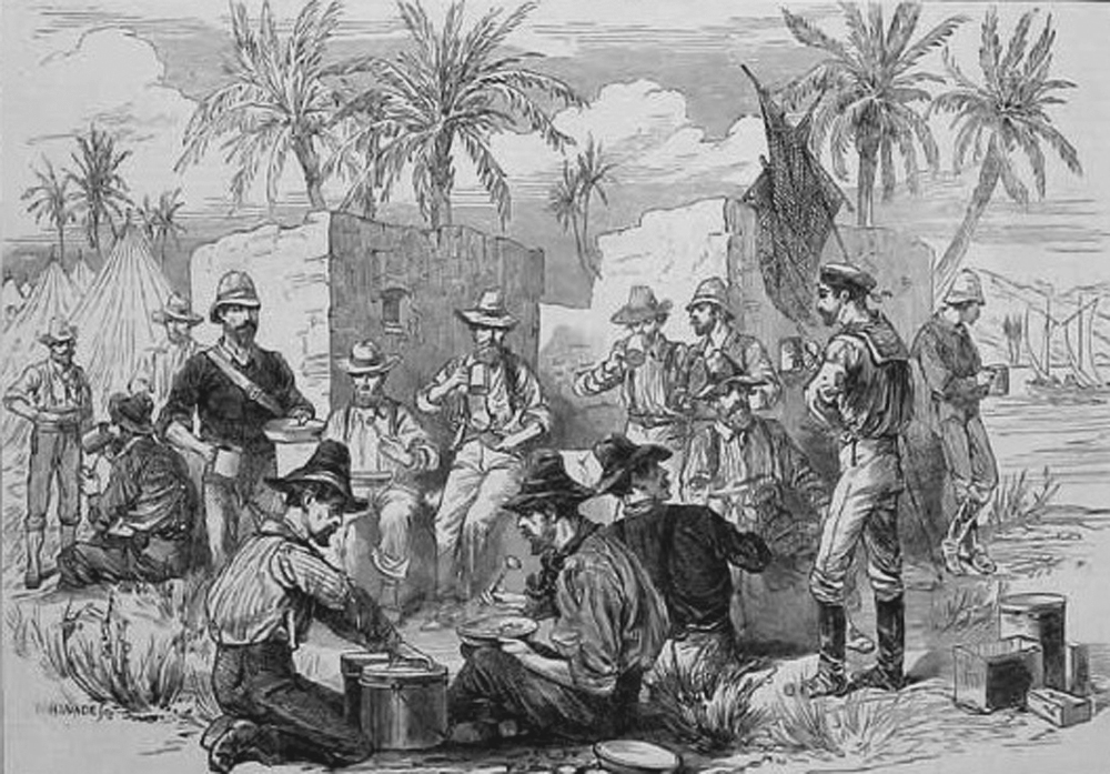 Die Kandier, leicht durch die zivile Kleidung erkennbar, beim Frühstück.Neben den Kanadiern und Westafrikanern wurden auch eine große Zahl Einheimischer und 800 Soldaten der Ägyptischen Armee eingesetzt. Diese Männer zogen vor allem die Seile, die zum Treideln der großen Flussdampfer und Segelschiffe verwendet wurden. Allein 847 Einheimische wurden eingesetzt, um die Whaler zu ihren Ausgangspunkten zu rudern und durch die ersten Katarakte zu ziehen.