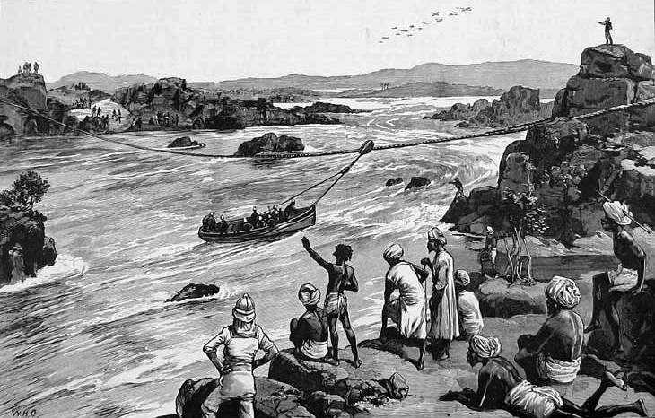 Neben den 6 großen Katarakten, den Granitbarrieren des Nils, gab es zahllose weitere Stromschnellen die zu überwinden waren. Allein zwischen dem 2. und 3. Katarakt lagen 10 nicht verzeichnete Katarakte: Semneh, Ambako, Tanjur, Akasheh, Dal, Amara, Sai, Kajbar, Simmet und Hannek. Insgesamt mussten die Boote auf einer Strecke von 20 Meilen durch den Nil gezogen werden. Das erste große Hindernis, der zweite Katarakt, konnten durch kombiniertes rudern, segeln und treideln erst nach 10 Tagen überwunden werden. Während dieser Tage, genau am 28. Oktober, ertrank der erste Kanadier…Louis Capitaine, ein 28-jahriger Caughnawaga Mohawk. Die Britischen Soldaten erhielten auf Grund der gefährlichen Stromschnellen zahlreiche Anweisungen zum Verhalten an Bord der Whaler. So war es strikt verboten, Personen an Bord zu lassen, die nicht unmittelbar zur Expedition gehörten. Verboten war ebenfalls, auf dem Dollbord zu sitzen. Während der Fahrt durch Stromschnellen sollten sich alle Insassen möglichst still verhalten und sich so wenig wie möglich bewegen. Bald machte man die Erfahrung, dass vor den Stromschnellen wichtige Ausrüstung ausgeladen und am Ufer getragen werden musste. Vor allem der Verlust von Waffen und Munition konnte nicht ersetzt werden.