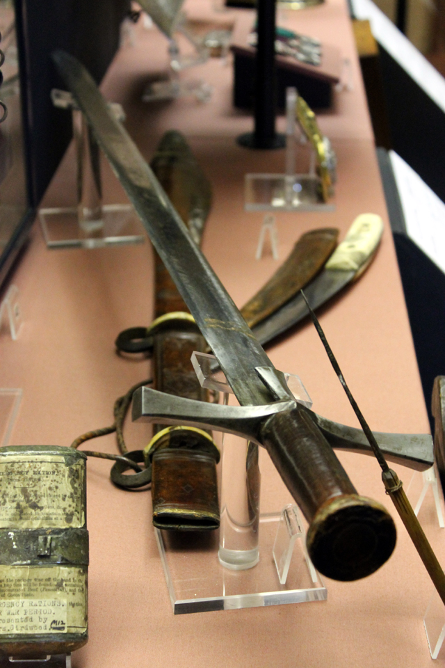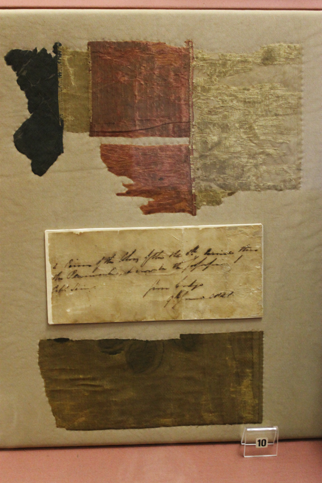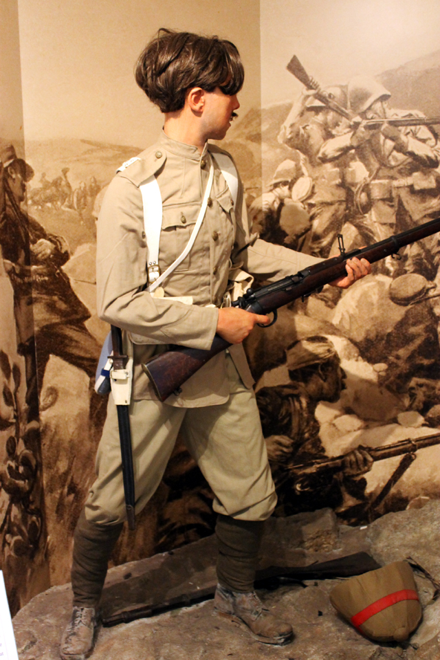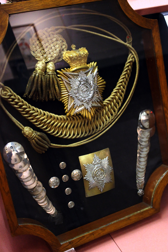 Überreste der Regiments-Fahne, die vom 2. Bataillon im Peninsular Krieg (1804 bis 1812) im Feld getragen wurde. Uniform und Ausrüstung im zweiten Burenkrieg, Südafrika 1899 – 1902 Notrationen (59), Becher bzw. Meßbecher (60), Rasierzeug, Sergeant Alder (61). Alle Gegenstände stammen aus dem zweiten Burenkrieg in Südafrika. Signalhorn, Südafrika 1899 – 1902 „Round-Cap“, Lagermütze eines OffiziersPercy Tenantry Volunteers