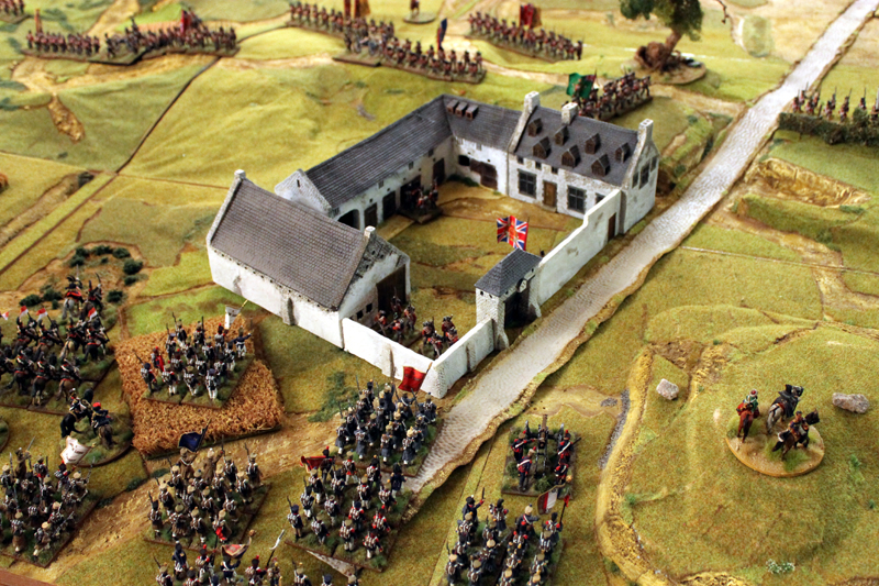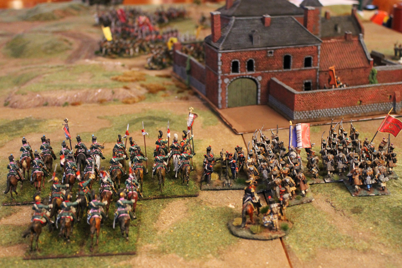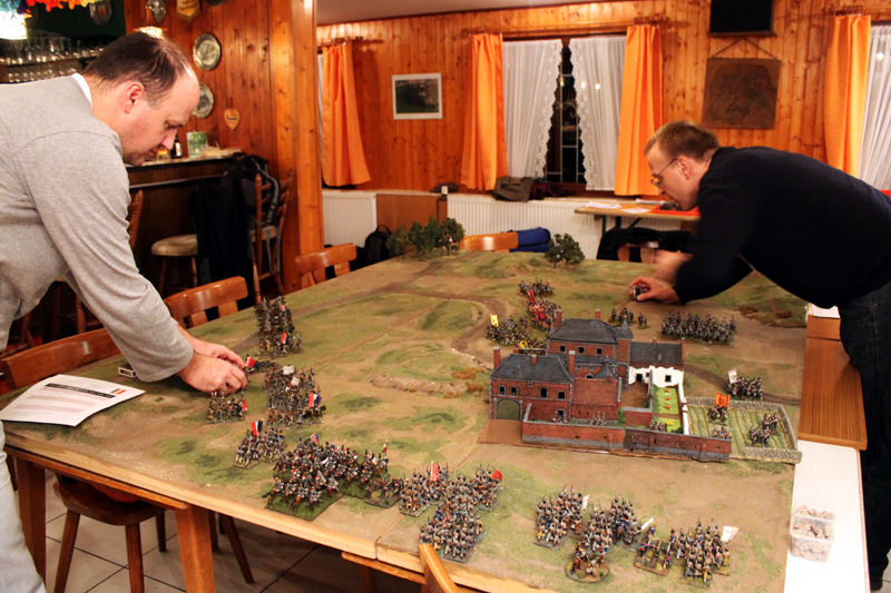 Zunächst aber ein paar einleitende Worte zum Schlachtfeld und den Grundregeln des Spiels. Das Ganze wurde im Maßstab 28 mm und mit dem Regelwerk Black Powder durchgeführt. Das hatte in erste Linie praktische Gründe, da für diesen Maßstab die meisten Figuren und von der Mehrzahl der Spieler Regelkenntnisse vorhanden waren. Das Schlachtfeld teilte sich in 4 Bereiche. Den aus französischer Sicht linken Flügel mit dem „Schloss“ Hougoumont, dem linken und rechten Zentrum mit der Farm La Haye Sainte in der Mitte, sowie dem rechten Flügel mit den Farmen Papelotte, La Haye, Fichermont und dem Dorf Plancenoit. Auf jeder Seite und hinter jedem Abschnitt lag außerdem eine Reservezone. An Truppen standen jeder Armee mehr oder wenige die historischen Einheiten in gleicher Zahl und Qualität zur Verfügung.